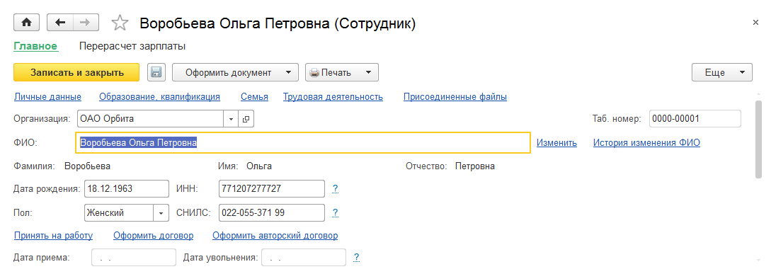 Для регистрации сотрудника создается запись в справочнике "Сотрудники".