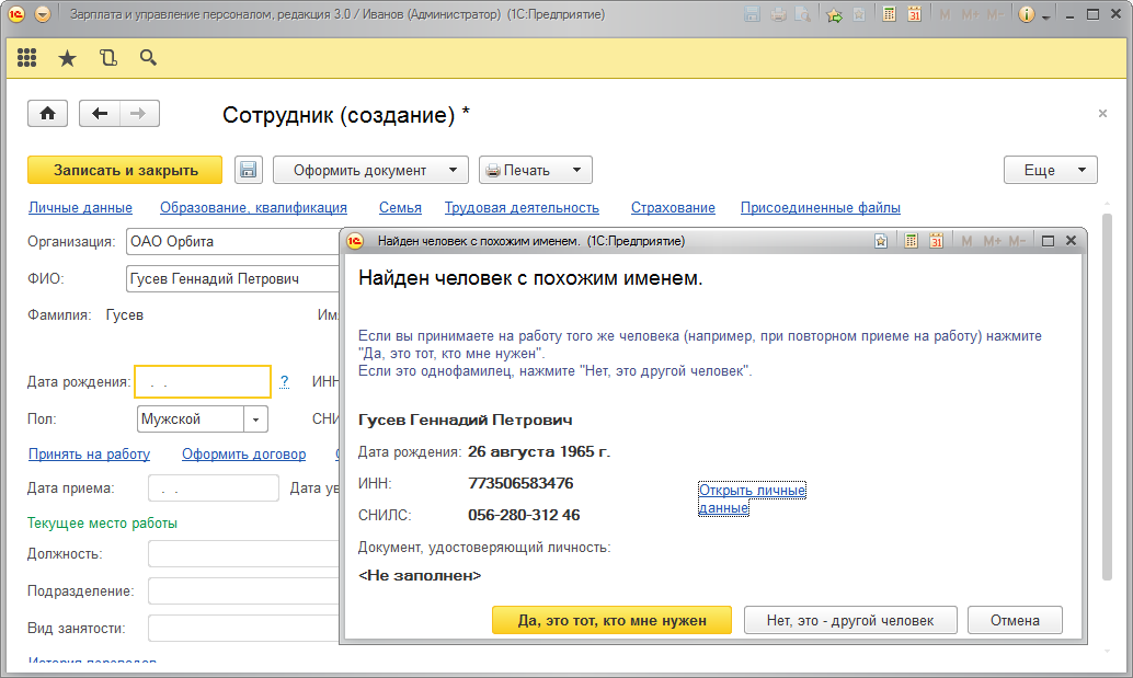 При оформлении сотрудника программа выдает сообщение о наличии похожего физического лица :