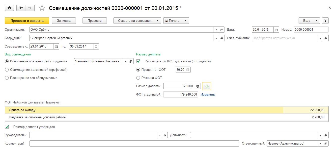 На основании документа "Отпуск по уходу за ребенком" Чайкиной Елизаветы Павловны создадим документ "Совмещение"