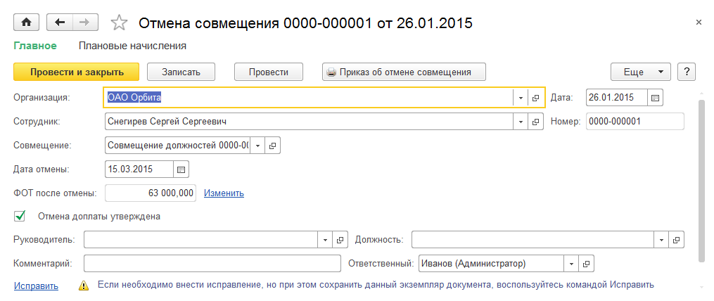 Сотрудница Чайкина Елизавета Павловна вернулась из отпуска по уходу за ребенком 15.03.2015. Доплата за совмещение Снегиреву Сергею Сергеевичу должна быть отменена