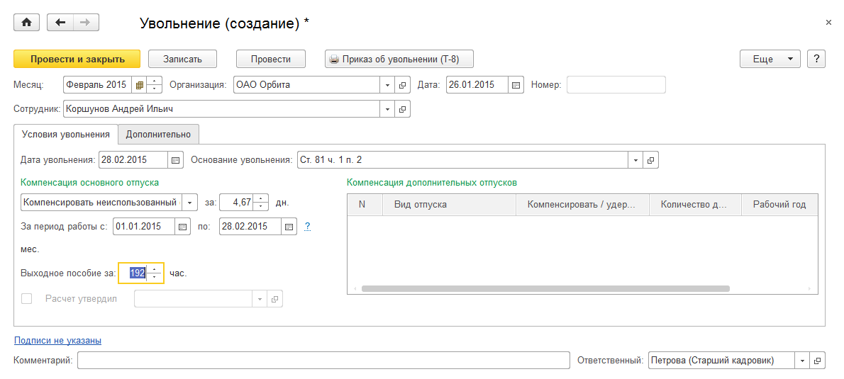 Сотрудник Коршунов Андрей Ильич 28.02.15 увольняется в связи с сокращением штата. При увольнении сотруднику полагается выходное пособие в размере среднемесячного заработка. Необходимо оформить увольнение в программе.
