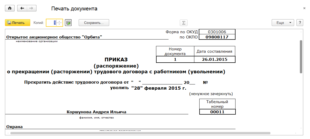 Формируем Приказ об увольнении: