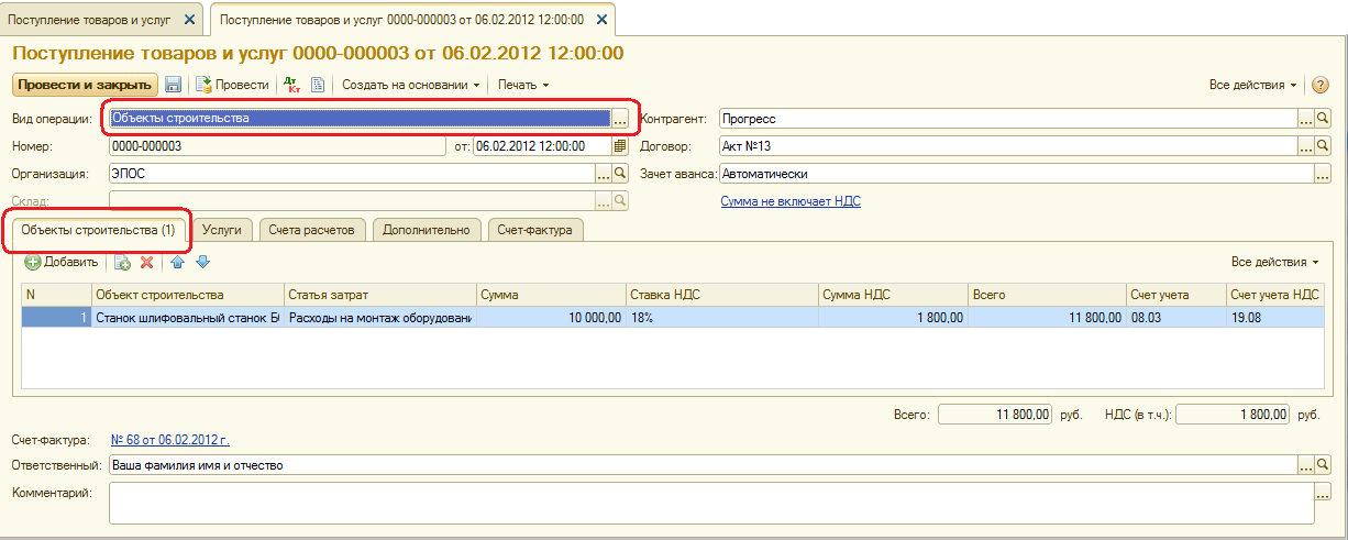 Организацией ЗАО «Прогресс», осуществлявшей монтажные работы, предъявлен счет-фактура № 68 от 06.02.2012 на оплату налога в сумме 1 800 руб.