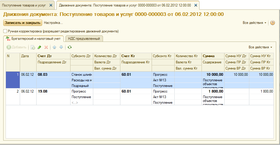 В результате проведения документом будут созданы две бухгалтерские записи. Они показаны на рис. 9-42. В первой записи увеличивается величина затрат, связанных с созданием объекта строительства Станок шлифовальный БСЗВ 5.5, на сумму, уплаченную АО Прогресс за проведение монтажных работ. Во второй записи отражается сумма НДС, предъявленного поставщиком за оказанные услуги по монтажу оборудования.