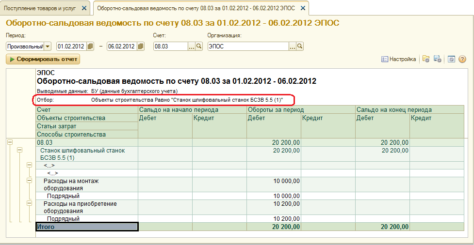 Для проверки правильности результатов выполнения задания рекомендуется сформировать отчет Оборотно-сальдовая ведомость по счету 08.03 за период с 01.02.2012 по 06.02.2012, установив отбор по виду субконто «Объекты строительства» равно Станок шлифовальный «БСЗВ 5-5» см. рис. 9-43.