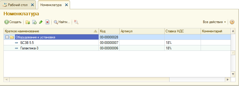 Ввести в справочник «Номенклатура» сведения о пилораме Галактика-3 и станке шлифовальном БСЗВ 5-5 – оборудовании, требующем монтажа