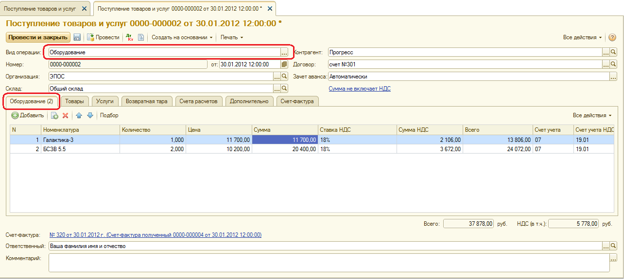 30.01.2012 в соответствии с договором № 23 от 19.01.2012 на общий склад ЗАО ЭПОС от поставщика ЗАО «Прогресс» в сопровождении товарно-транспортной накладной и счета №301 от 25.01.2012 поступило производственное оборудование, требующее монтажа и наладки.
