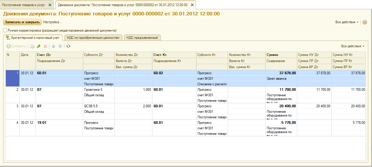 Во второй проводке отражено поступление одной единицы оборудования «Галактика-3» от поставщика «Прогресс» по счету №301.