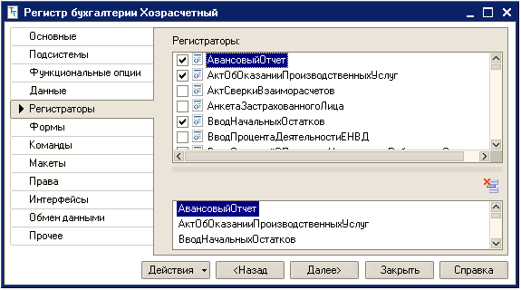 Стоит понимать, что не все документы, предусмотренные типовой конфигурацией, регистрируют бухгалтерские события, например, «Доверенность». Документы, формирующие записи в регистре бухгалтерии, должны быть установлены в качестве регистраторов на закладке «Регистраторы» при настройке объекта «Регистр бухгалтерии» в режиме конфигурирования.