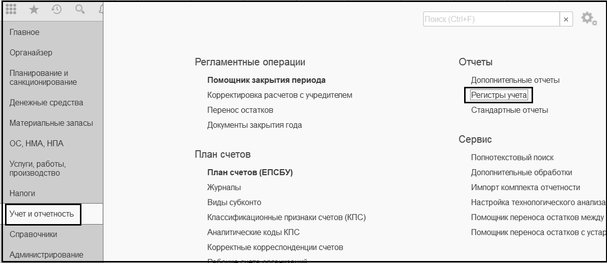 Учет и отчетность, далее команда панели функций