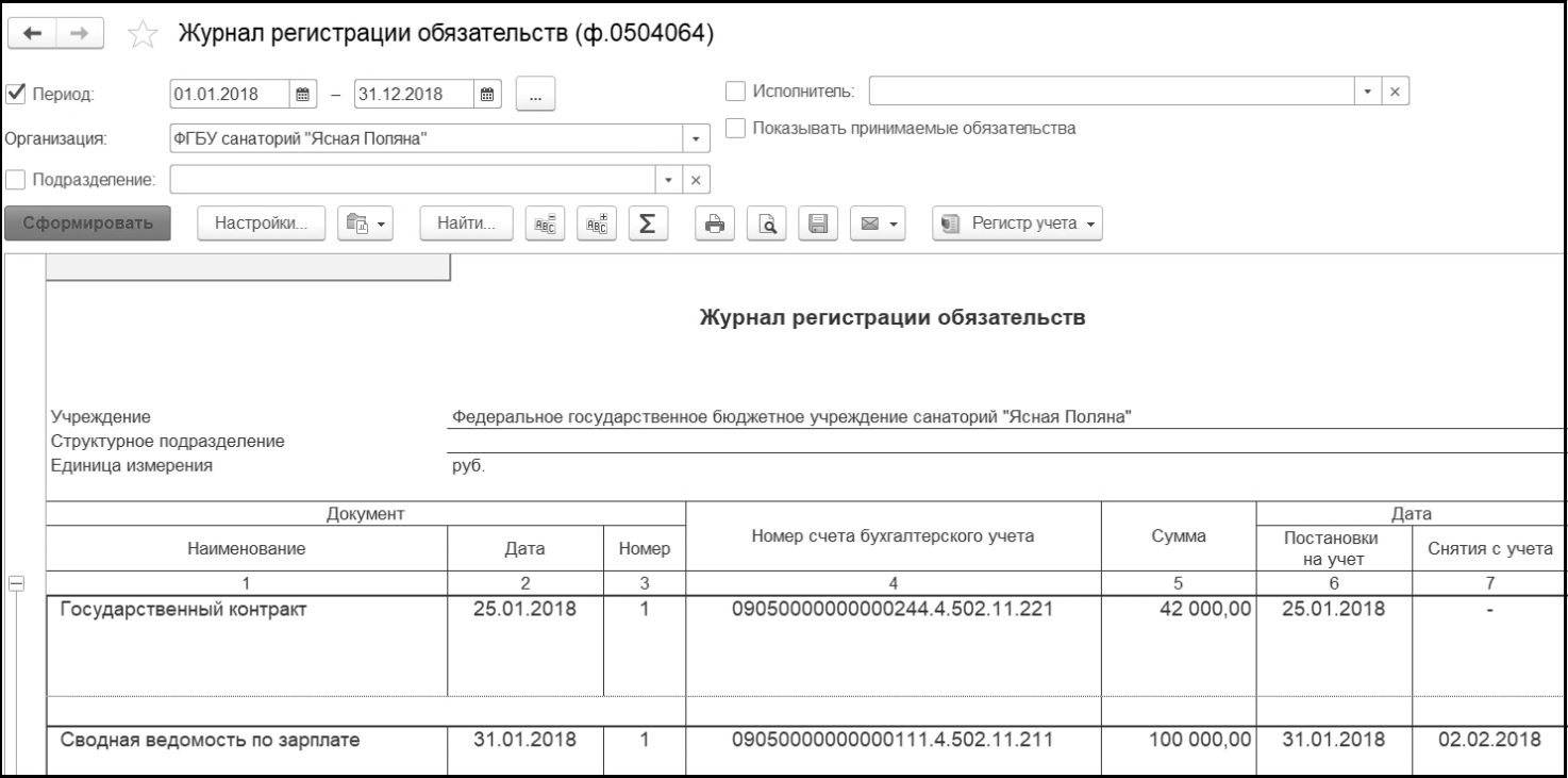 Журнал регистрации обязательств" (ф. 0504064).