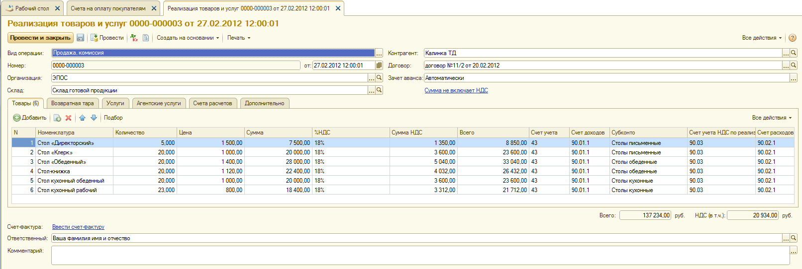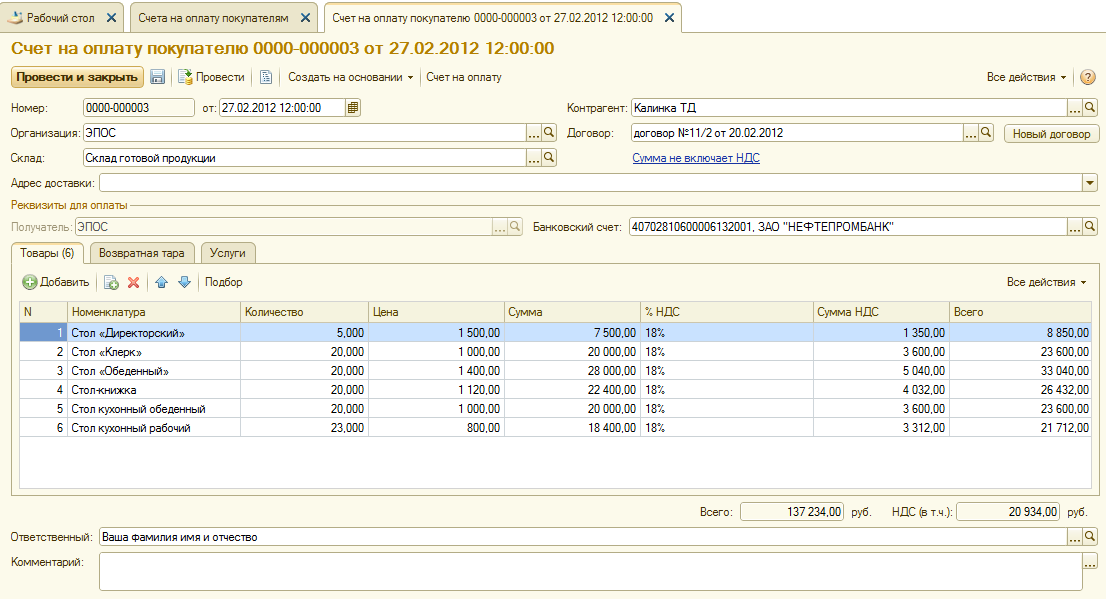 27.02.2012 в соответствии с договором о поставке мебели № 11/2 от 20.02.2012 торговому дому «Калинка» (ИНН 7717218005, КПП 771701001) выписан счет № 3 на оплату на сумму 137 234.00 руб., в том числе НДС 20934.00 руб. и товарная накладная № 3 на отгрузку продукции в следующем ассортименте: