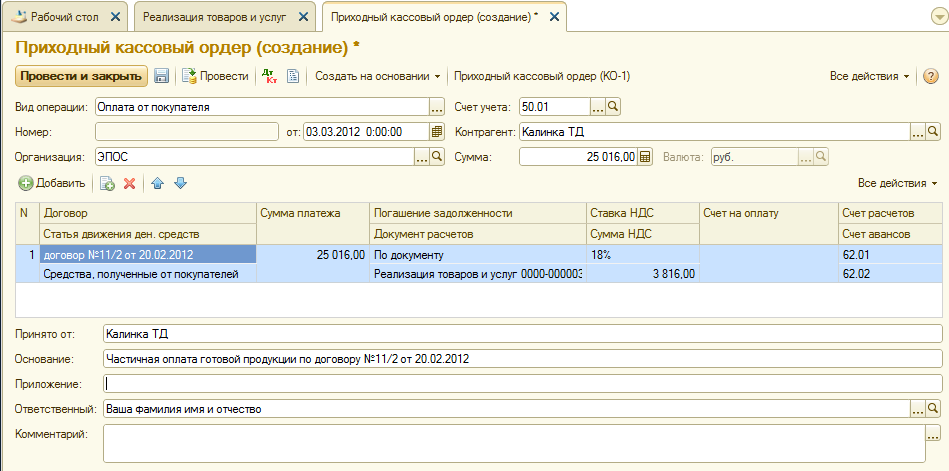 При этом откроется форма ввода документа Приходный кассовый ордер (создание), в котором многие поля будут заполнены данными из документа-основания.