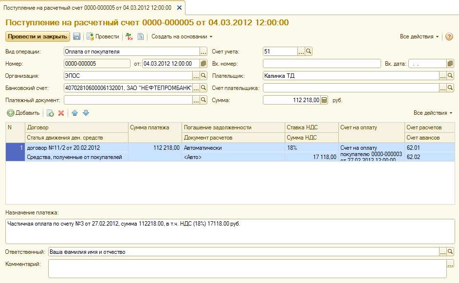 В основании платежа платежного поручения указано: Частичная оплата по счету № 3 от 27.02.2012, сумма 112 218.00, в том числе НДС (18%) 17 118.00 руб.