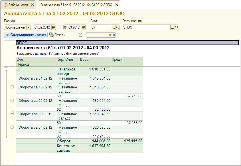 Рис. 14-14. Анализ счета 51 за период с 01.02.2012 по 04.03.2012