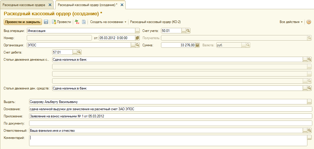 . В результате откроется экранная форма ввода документа Расходный кассовый ордер (создание).