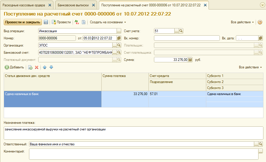 – в реквизите Основание записать - сдача наличной выручки для зачисления на расчетный счет ЗАО ЭПОС;