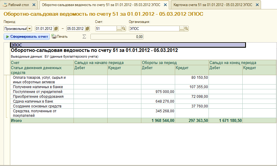 Проверяем контрольные цифры по оборотно-сальдовой ведомости по счету 51. Сальдо дебетовое на 05.03.2012 составляет 1 671 064.50 руб. (рис. 14-17).