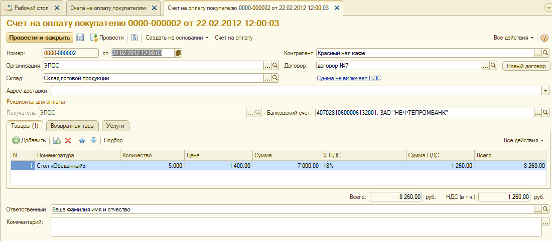 Подготовить счет на оплату покупателю № 2 от 22.02.2012 на поставку кафе «Красный нал» столов обеденных по отпускной цене + НДС 18%.