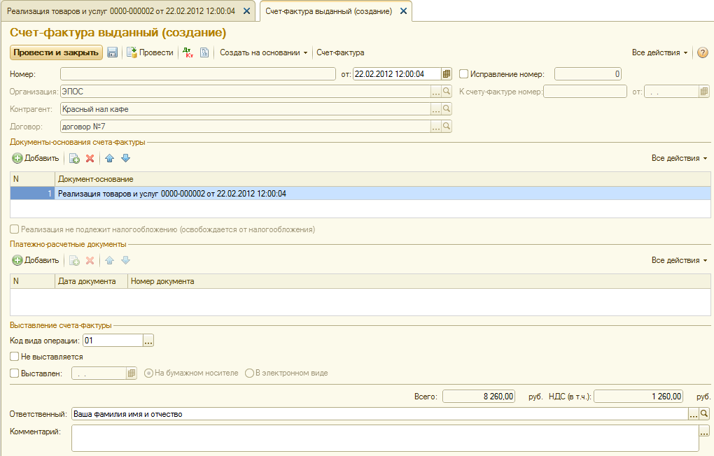 Подготовить счет-фактуру № 2 от 22.02.2012 по операции продажи мебели кафе «Красный нал».