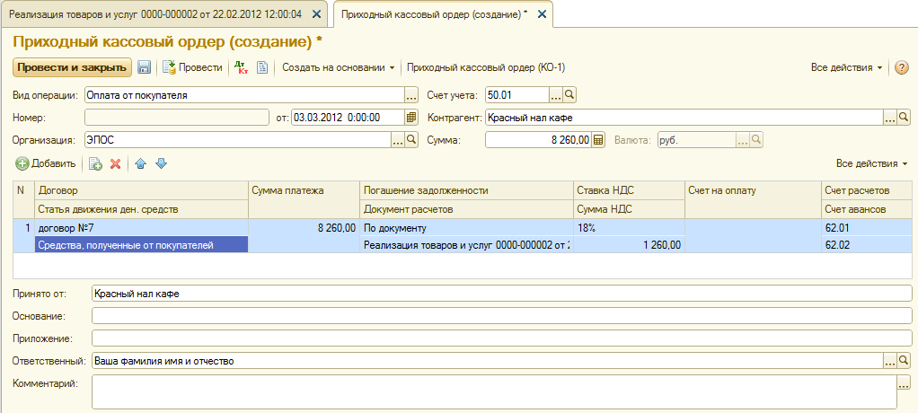 Составить приходный кассовый ордер № 7 от 03.03.2012 на сумму 8260.00 руб. на основании документа отгрузки. Денежные средства в кассу организации вносит уполномоченный представитель кафе «Красный нал» в счет оплаты счета № 2 от 22.02.2012.