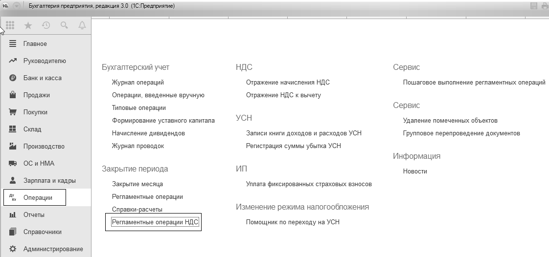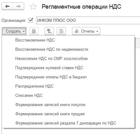 Книга покупок, Книга продаж, декларация по налогу на добавленную стоимость в программе заполняются автоматически. Записи книги покупок и продаж формируются при проведении первичных учетных документов (так, счетов-фактур выданных, счетов-фактур полученных и других). Но этих операций недостаточно, поэтому в конце месяца следует провести некоторые регламентные процедуры. К таким регламентным процедурам относятся: "Подтверждение нулевой ставки НДС", "Подтверждение оплаты НДС в бюджет", "Распределение НДС", "Начисление НДС по СМР хозспособом", "Восстановление НДС", "Восстановление НДС по недвижимости", "Списание НДС", "Формирование записей книги покупок", "Формирование записей книги продаж" и "Формирование записей раздела 7 декларации НДС" (меню "Панель разделов/Операции/Панель навигации/Закрытие периода/Регламентные операции НДС").