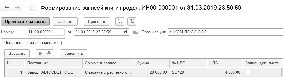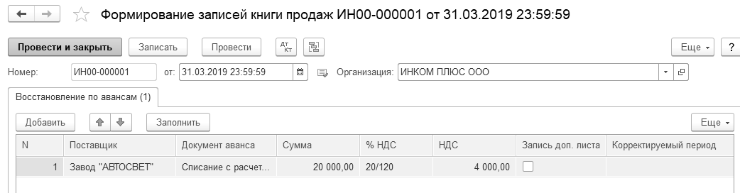Рис. 20.1.16. Фрагмент формы документа "Формирование записей книги продаж", закладка "Восстановление по авансам"