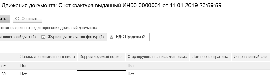 Если пользователь программы ошибочно не выставил счет-фактуру на аванс в предыдущем периоде, нужно, чтобы был сформирован дополнительный лист книги продаж. Исправить ошибку в программе можно, например, так. Найти счет-фактуру на аванс, в котором сделана ошибка, открыть движения этого документа, установить возможность корректировки движений документа (флаг "Ручная корректировка"), в регистре "НДС продажи" вручную установить признак формирования дополнительного листа "Да" и указать дату предыдущего квартала в графе "Корректируемый период" (рис. 20.1.11). Так счет-фактура на аванс попадет в дополнительный лист книги продаж за предыдущий квартал и уточненную декларацию по НДС.