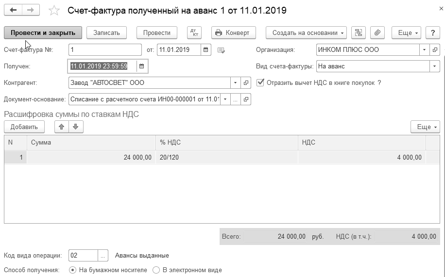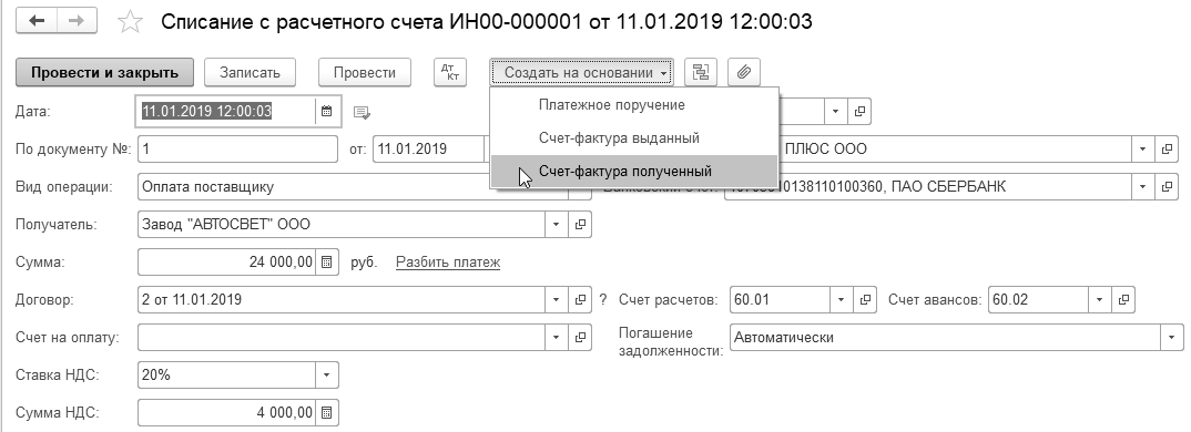 11.01.2019 года от завода "АВТОСВЕТ" поступил счет-фактура № 1 от 11.01.2019 года. Необходимо зарегистрировать данный документ на основании документа "Списание с расчетного счета" поставщику "АВТОСВЕТ" на сумму 24 000 руб., НДС 20% в т. ч. (рис. 20.1.12).
