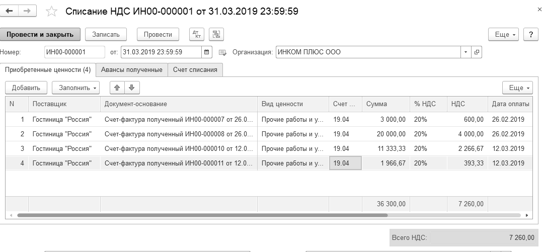 31.03.2019 года создайте документ "Списание НДС".