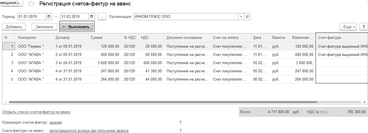 Выполните обработку "Регистрация счетов-фактур на аванс" за 1 квартал 2019 года.