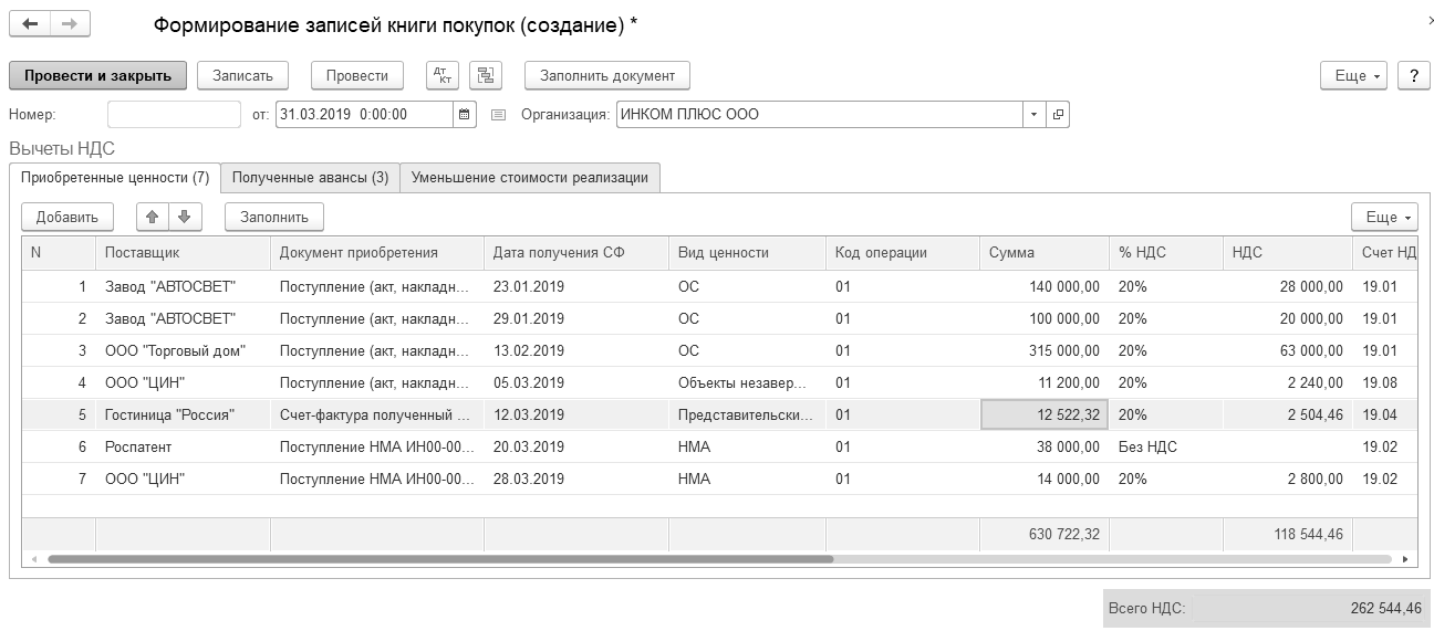 31.03.2019 года создайте документ "Формирование записей книги покупок" (рис. 20.1.17).