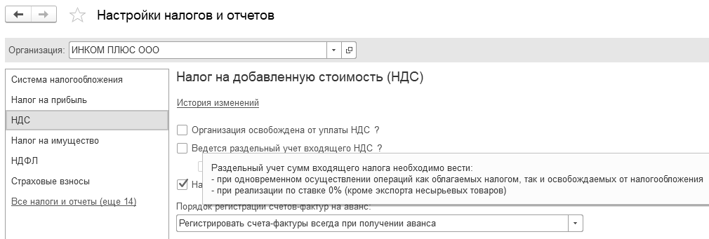 Перед началом учета НДС следует проверить настройки налогов и отчетов организации (меню "Панель разделов/Главное/Панель навигации/Настройки/Налоги и отчеты") (рис. 20.1.3).