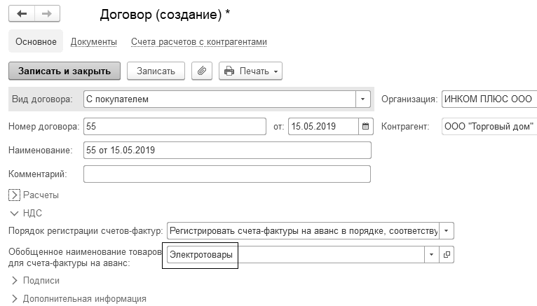 При оформлении "авансового" счета-фактуры по таким договорам следует указывать обобщенное наименование товаров (рис. 20.1.7).
