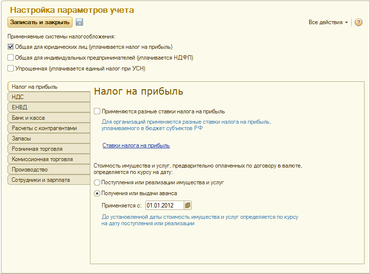 В общем случае в одной информационной базе допускается ведение бухгалтерского и налогового учета для нескольких организаций. При этом организации могут применять различные режимы налогообложения, осуществлять различные виды деятельности и т.д. Параметры учета общие для всех организаций задаются в форме настройки параметров учета (доступ через Панель разделов → Справочники и настройки учета → Настройка параметров учета). Параметры задаются на закладках формы настройки.