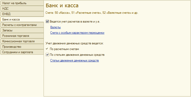 На закладке Банк и касса (рис. 2-13) указывается, ведется ли в организации учет расчетов в иностранной валюте. Здесь же имеются гиперссылки открывающие для ввода/редактирования список валют и список бухгалтерских счетов с особым порядком переоценки.