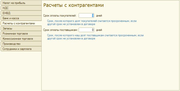 Для целей управления дебиторской и кредиторской задолженностью на закладке Расчеты с контрагентами (рис. 2-14) указывается срок (в днях с момента возникновения задолженности), по истечении которого задолженность покупателей и задолженность перед поставщиком считается просроченной, если иной срок не указан в свойствах конкретного договора с контрагентом.