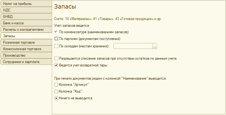 На закладке Запасы (рис. 2-15) указывается, разрешается ли списание запасов при отсутствии остатков по данным учета; ведется ли учет возвратной тары, а также вводятся параметры аналитического учета на счетах учета запасов (10 «Материалы», 43 «Готовая продукция» и др.), где помимо обязательного аналитического учета по номенклатуре может быть добавлен аналитический учет по партиям и складам.