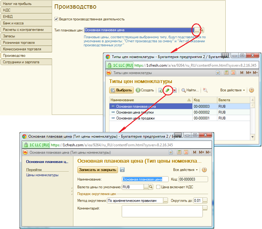 На закладке Производство имеется возможность установить флажок Ведется производственная деятельность. Если флажок установлен, то в дальнейшем можно будет вести учет производственной деятельности. В этом случае на этой закладке будет доступно для редактирования поле Тип плановых цен. Установленное в нем значение будет подставляться по умолчанию в документах, которыми отражается передача готовой продукции на склад и оказание производственных услуг. По умолчанию значением является Основная плановая цена, в рублях, не включает НДС (рис. 2-16).