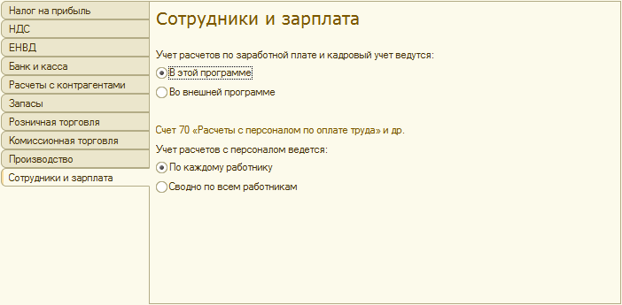 На закладке Сотрудники и зарплата (рис. 2-17) указывается, в какой программе будут производиться кадровый учет и расчеты с персоналом по оплате труда: в этой программе или в специализированной внешней программе по учету труда и заработной платы. Также здесь определяется как будет организован аналитический учет на счете 70 «Расчеты с персоналом по оплате труда»: по каждому работнику или сводно по всем работникам.