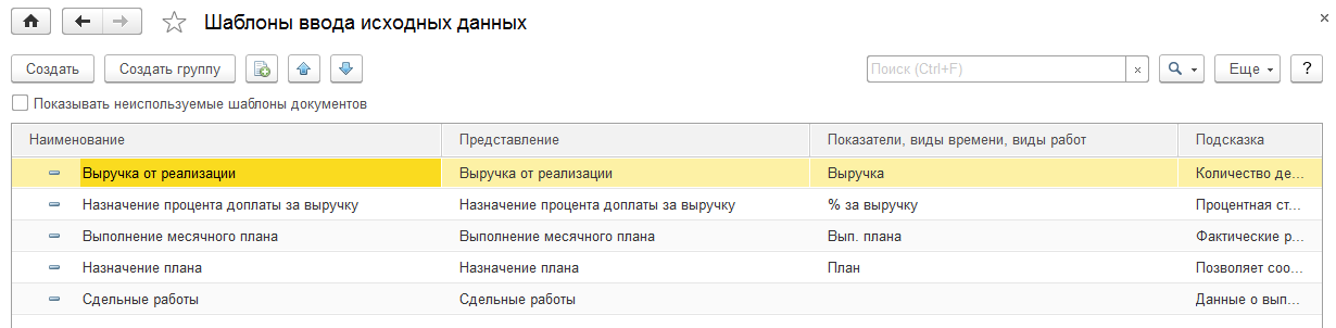 Все возможные варианты шаблонов документа по вводу значений показателей расчета можно настроить в справочнике "Шаблоны ввода исходных данных" (раздел "Настройка"). Некоторые шаблоны добавляются автоматически при определенных настройках программы (для сдельного заработка) или стартовым помощником (для премий, вводимых при окончательном расчете зарплаты, для доплат за выполнение плана и доплат от выручки).