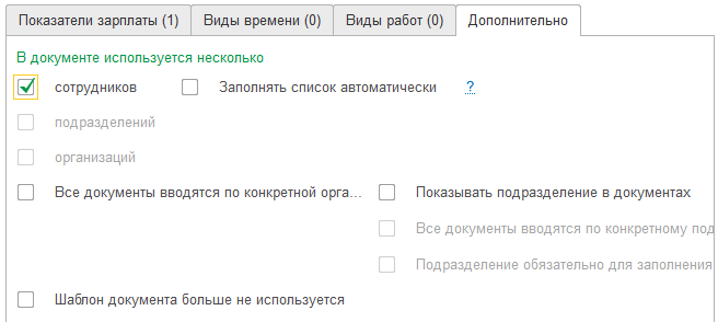 Далее на закладке "Дополнительно" необходимо настроить, как будет заполняться документ. В зависимости от выбранного показателя в документе может быть заполнен список сотрудников, подразделений либо организаций.