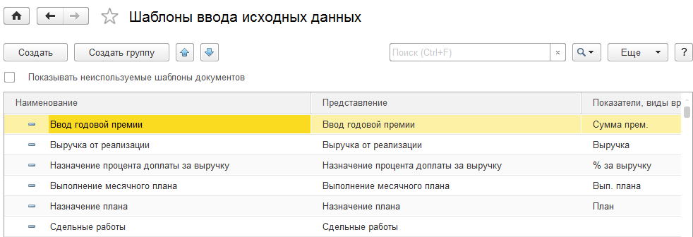 Все возможные варианты шаблонов документа по вводу значений показателей расчета можно настроить в справочнике "Шаблоны ввода исходных данных" (раздел "Настройка"). Некоторые шаблоны добавляются автоматически при определенных настройках программы (для сдельного заработка) или стартовым помощником (для премий, вводимых при окончательном расчете зарплаты, для доплат за выполнение плана и доплат от выручки).