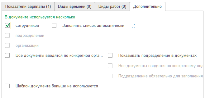 Далее на закладке "Дополнительно" необходимо настроить, как будет заполняться документ. В зависимости от выбранного показателя в документе может быть заполнен список сотрудников, подразделений либо организаций.