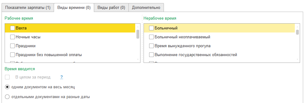 Если документ необходим для ввода времени, то на закладке "Виды времени" отмечаются флажками те виды, которые будут заполняться данным шаблоном. По умолчанию время вводится за каждый день периода. Установка флажка "Время вводится в целом за месяц" означает, что количество часов будет введено сводно за месяц.