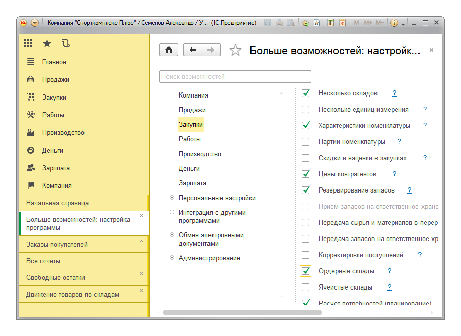 Запасы могут перемещаться между ячейками (документ "Перемещение по ячейкам" в разделе "Закупки"). Отгрузка запасов со склада и поступление на склад могут также вестись с учетом ячеек. Для этого во всех документах, связанных с перемещением запасов, присутствует реквизит "Ячейка".