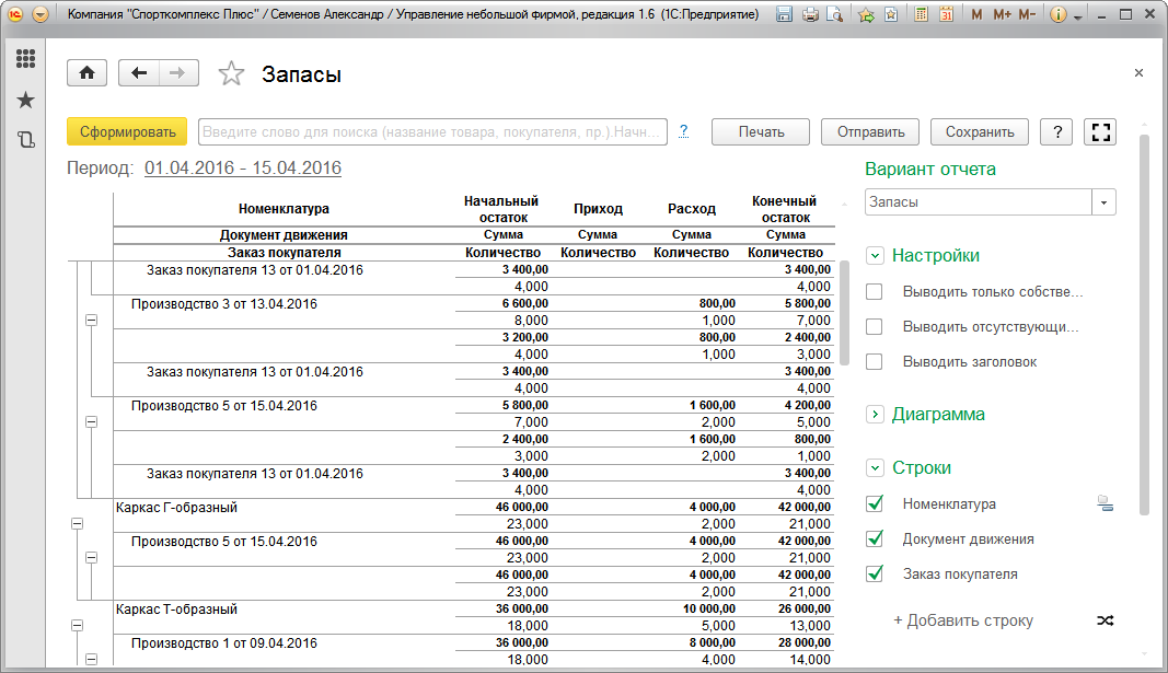 Отметим также, что отчет "Запасы" может формироваться в двух вариантах - "Остатки запасов" и "Ведомость по запасам".