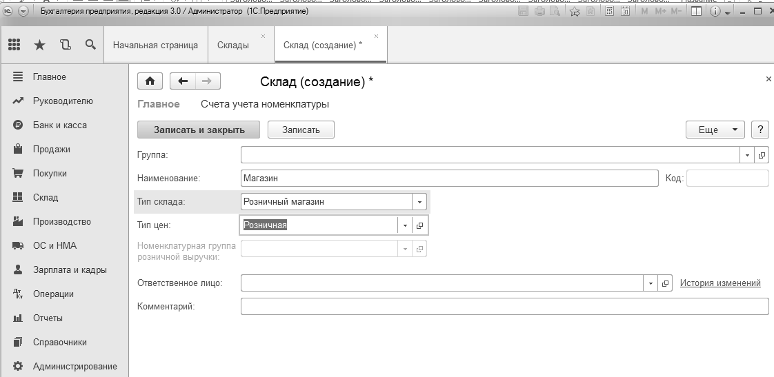 Справочник "Склады". В организации есть основной склад и магазин. Создайте склад – "Магазин". Для магазина установите тип цен "Розничная", тип склада "Розничный магазин" (рис. 1.11.1).
