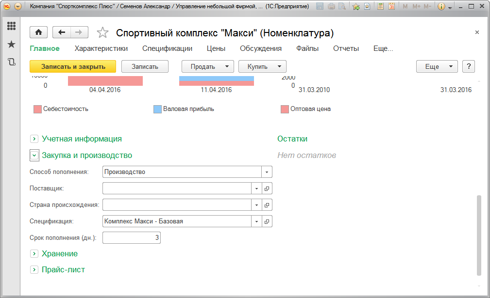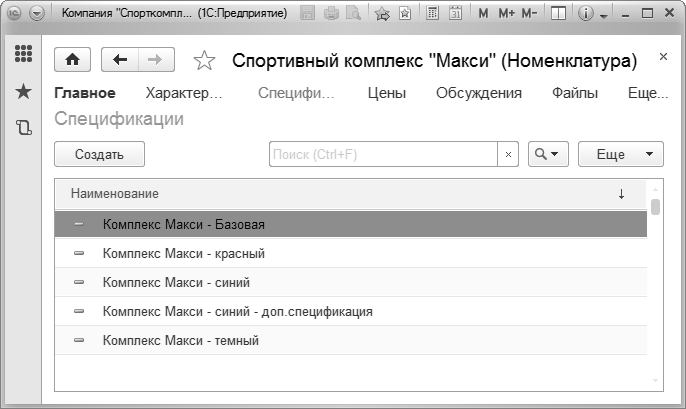 Какие материалы (сырье) используются при выпуске продукции, и какие технологические операции при этом выполняются, определяет Спецификация. Спецификаций может быть несколько для одной и той же единицы продукции. Но, как правило, одна из них является основной, ее и можно указать в карточке номенклатуры на вкладке "Параметры хранения и закупки". См. Рис. 131. Перечень всех спецификаций номенклатурной позиции можно увидеть, нажав на ссылку "Спецификации" в верхней части карточки номенклатуры. См. Рис. 131 и Рис. 132.