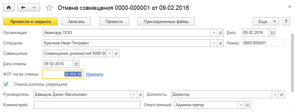 Для прекращения доплаты за совмещения вводится отдельный приказ "Отмена совмещения".